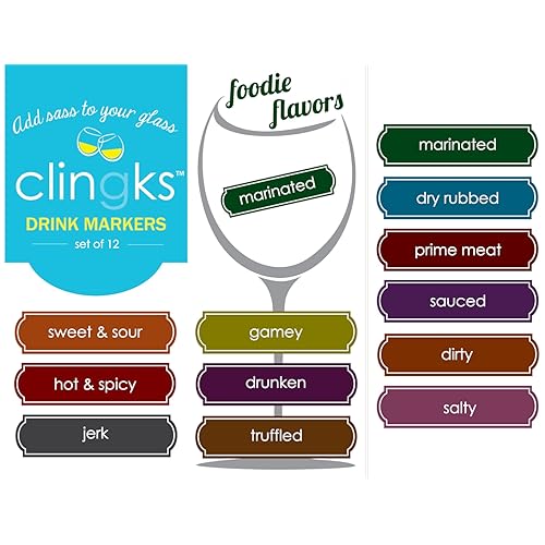 SodaStream offers over 60 different flavor varieties to satisfy every taste and mood. Tilt the carbonated water bottle to a 45-degree angle, and pour the sodamix down along the inside wall of the bottle. Use a pre-dosed sodamix portion pack or pour your preferred flavor amount from a full-sized bottle to customize your taste experience. (Yes! You can adjust the intensity and sweetness of our drink by varying the amount of sodamix you put into the bottle. You can use a cup as your measuring devise.)the Clingks 12 Drink Markers - Foodie Flavors Place SodaStream’s signature fizz-preserving bottle cap on your soda bottle and tighten. Gently roll or shake the bottle to ensure the sodamix is thoroughly combined with the carbonated water. Allow to settle for a few moments (now would be a good time to prepare your drinking glasses and garnishes!) and carefully uncap.Clingks 12 Drink Markers - Foodie Flavors is best for youWine charms dangling off the stems are so yesterday. Modern wine glasses are stemless and highballs don't have stems. So how do you keep track of your glass at your party? We have just the thing... Clingks are the hippest trend in glassware...removable, reusable decals that cling to glasses, bottles, coffee mugs, even plastic! The sassy phrases will put your guests in the party spirit right from the start. Like Fine Wine Sayings: full-bodied, acidic, herbacious, sexy, vintage, great legs, corked, bubbly, needs to breathe, complex, dry, tannic FAQ: Q: My Clingks won't stick on my empty glass. A: Clingks perform best with a little moisture or condensation. You can 'fog' the glass with your breath or run the Clingks labels under water for a second. Q: Are Clingks reusable? How many times can I reuse them? A: Yes. You can reuse them from one glass to another in the same night. If handled gently, they can last for several parties. However, they are priced for one-night use. Q: Best way to store Clingks? A: Rinse them off, and place back on the card they came in. For longer storage, place card in a zip-top bag.