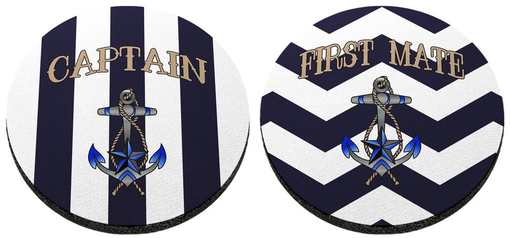 • The Sailing Gift Captain and First Mate Coaster Bundle 2 Pack Round Rubber Drink Cup Coasters Chevron is a