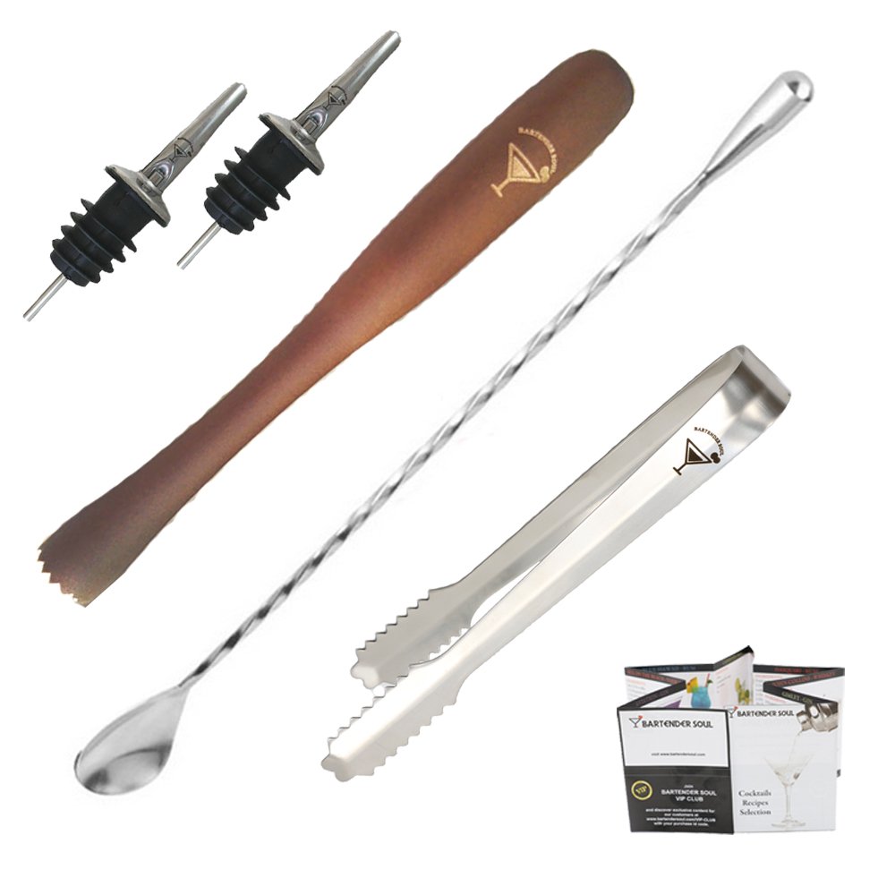 • The Bartender Soul Cocktails Essential Tool Set w/ Professional Weighted 12'' Bar Spoon, Wooden 10'' Muddler, 2 Pourers & Ice Tongs. Recipes Pocket Book Included. Premium Complement for Shakers. is a