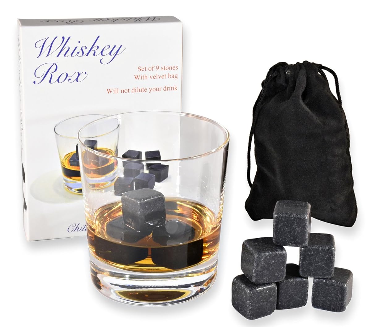 • The WHISKEY ROX - BLACK WHISKEY STONES (Set of 9) — Natural Polished Black Granite Stone — Reusable Scotch Rocks — Premium Whisky Chilling Cubes — Better Than Ice — Gift Box — BONUS: Black Velvet Pouch is a